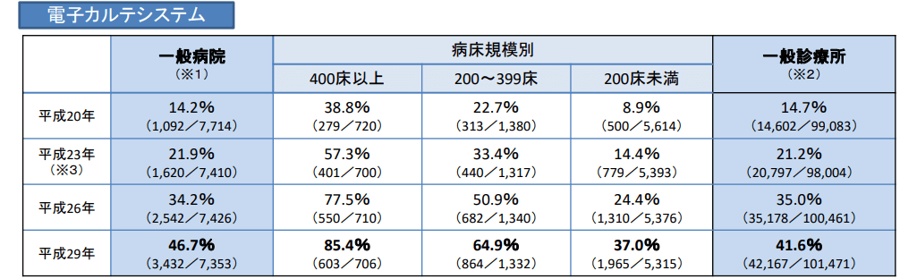 平成29年度のデータによると、電子カルテを導入している病院は一般病院でも46.7%と、まだ低い水準にあります。